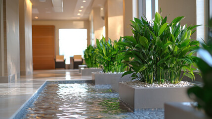 Elegant indoor planters in spa lobby enhancing serene atmosphere with lush greenery and tranquil water features, creating calming environment for relaxation