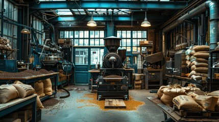 The interior of a coffee roastery, with machines, bags of beans, and the roaster at work, illustrating the industrial atmosphere