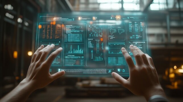 Engineer using futuristic transparent screen displaying data in industrial environment