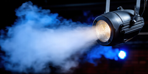 Stage light spotlight theater smoke fog beam blue performance illumination dramatic stage light spotlight with focused beam cutting through swirling smoke fog blue background creating dramatic