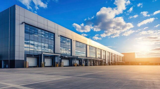 Modern warehouse building with large glass windows and loading docks under a bright blue sky with white clouds.