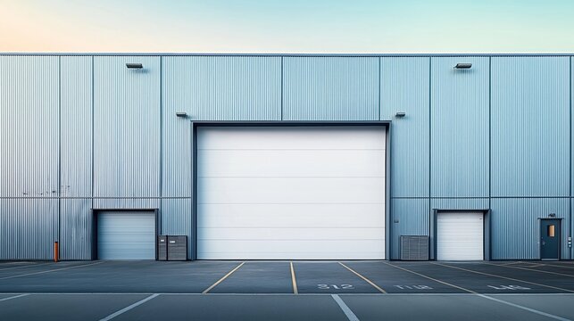 Modern industrial building exterior with blank signage. Large empty loading bay. Structure contemporary design elements. Pale blue corrugated metal panels. Empty white sectional door. Parking spaces