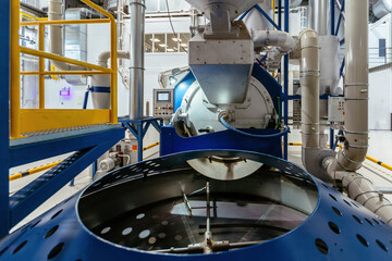 Large industrial coffee roaster machine with sacks of coffee beans in a factory setting for commercial usage and mockups