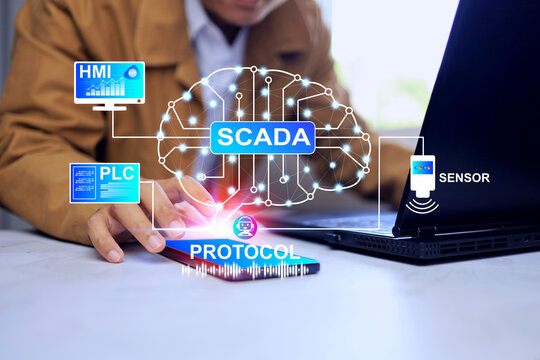 SCADA supervisory control and data acquisition concept with a man programming and logic setting for real time checking and data analysis control process and monitor on human machine interface