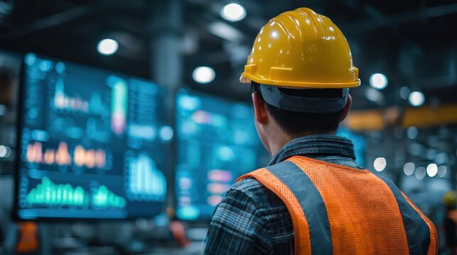 Worker in yellow hard hat, orange safety vest views large tech screen. Digital display shows real time charts, graphs for modern factory data. Enginee