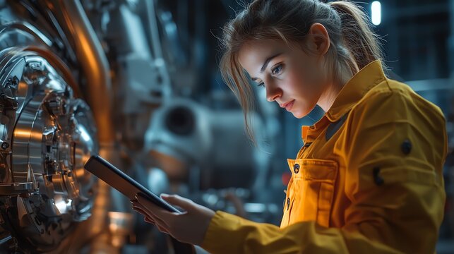 A young woman in a yellow jumpsuit works on a complex piece of machinery, inspecting it with a tablet.