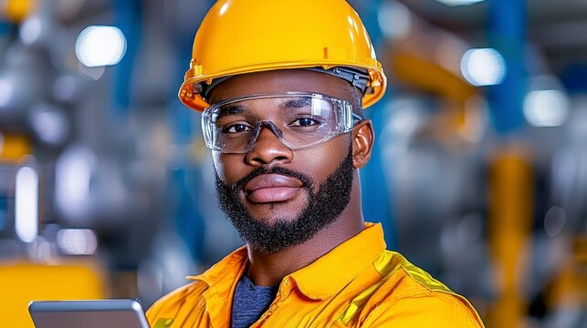 Construction worker using tablet in industrial setting workshop portrait bright environment professionalism