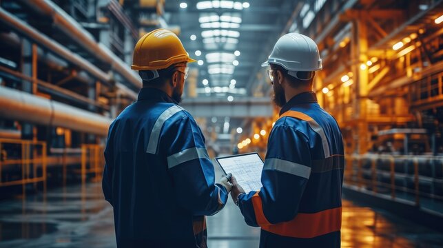 Two civil engineer in safety helmet hard hat using digital tablet and blueprint working while standing at factory. Generative AI.