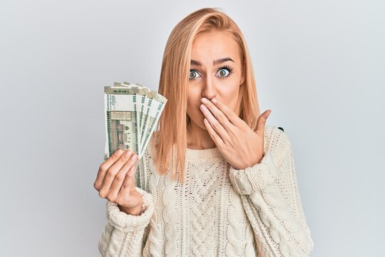 Beautiful caucasian woman holding 500 indian rupee banknotes covering mouth with hand, shocked and afraid for mistake. surprised expression