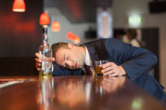 Homeless alcoholic man sleeping on a bar counter