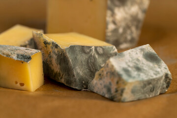 Moldy Cheese. A Decayed and Rotten Cheddar Cheese inedible due to Mold
