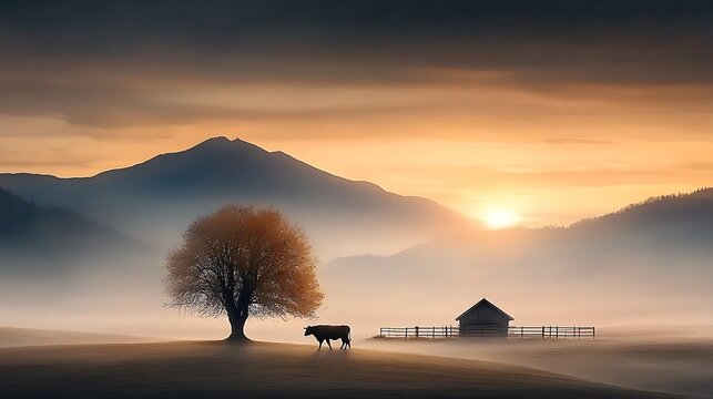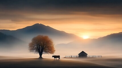 A tranquil scene of a cow being led into a wooden enclosure at twilight, with the surrounding landscape bathed in soft, fading light, symbolizing karma's inevitable return Ultra-Realistic Photo