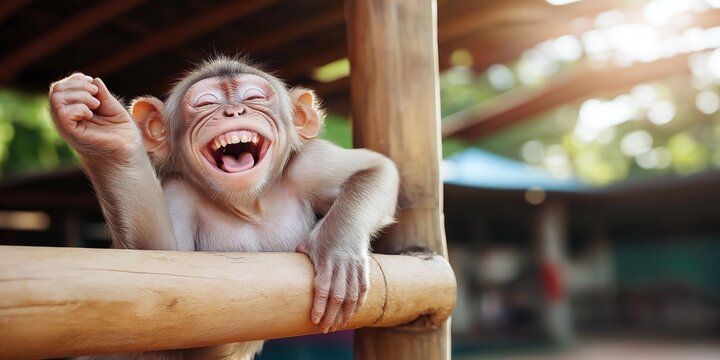 Joyful baby monkey laughing on wooden fence in sunlit zoo