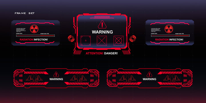 Attention Danger The threat of radiation infection Set of red frames and pop-up screens on black background. Futuristic screens with elements of HUD, GUI, UI