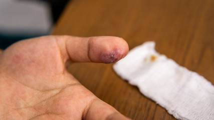 An infection wound with pus inside the thumb on the white bandage with blood stains. Hygiene, infected.