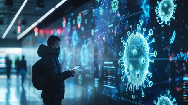 High Tech Digital Wall Displaying Real-Time Stats and Prevention Tips for Global Virus Pandemic in Public Space