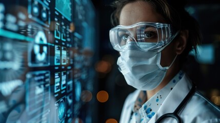 Scientist analyzing vaccine data with digital covid-19 statistics