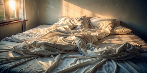 A rumpled bed with tangled sheets and a single, abandoned pillow, illuminated by soft morning light, evoking feelings of sadness and loneliness.