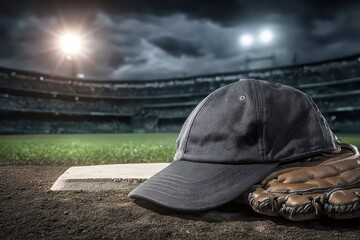 Baseball Cap And Glove On Field Home Plate At Night Game Stadium Lights Blazing