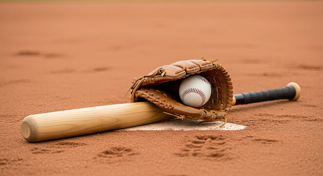 Classic baseball bat and ball resting on the dirt infield ready for the game, evoking memories of summer fun and competitive sports, outdoor recreation