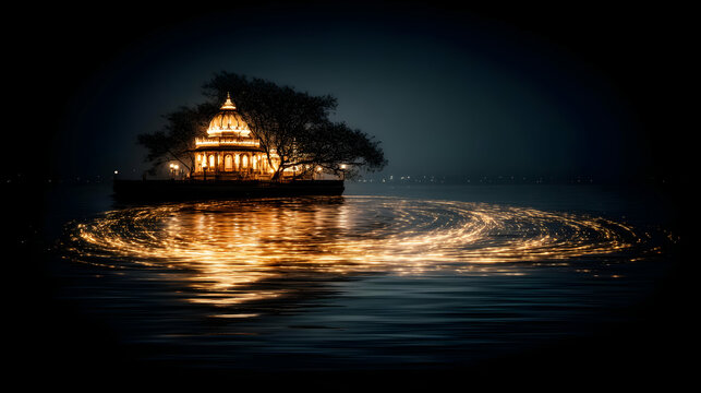 Golden lantern reflection shimmering on misty twilight lake with forest silhouette