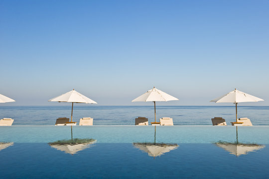Beautifull luxury swimming pool near beach front with amazing ocean view and deck chairs at sunny day