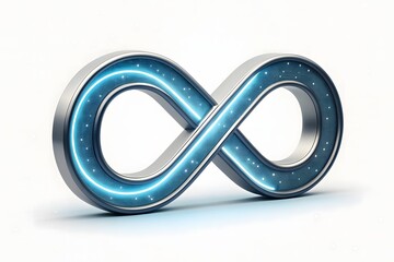 Gleaming metallic infinity symbol illuminated by electric blue digital circuitry on a white background