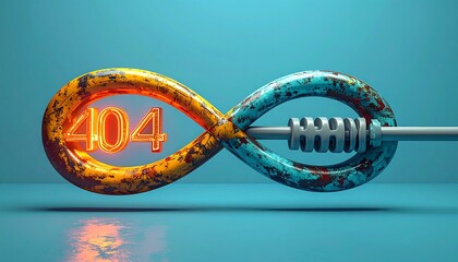 A surreal illustration, featuring an infinity symbol intertwined with a digital-looking cable and the error message "404