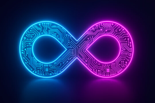 A glowing infinity symbol, half electric blue and half vibrant pink, intricately designed with circuit board patterns against a dark, abstract background.