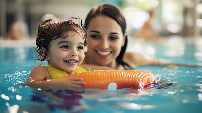 Banner Swimming school for children, woman trainer holds inflatable armbands for kids accessories