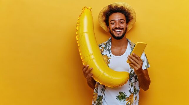 Smiling man enjoying summer in swimming pool with inflatable supplies