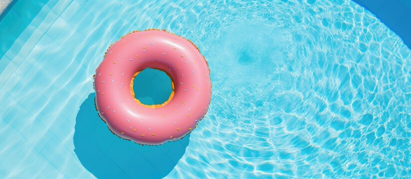Vibrant inflatable donut rings and letter floats bob playfully on a sparkling blue swimming pool surface on a sunny day