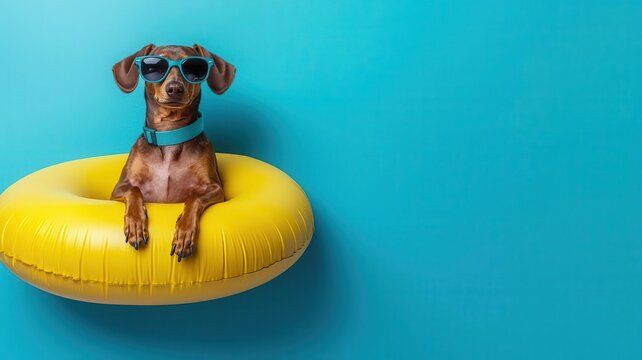 Dachshund with sunglasses, relaxing on an inflatable donut, 3D illustration