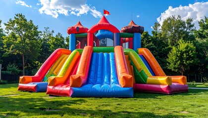 Vibrant inflatable playground with rainbow slide and towers on sunny day