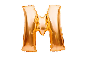 Letter M made of golden inflatable helium balloon isolated on white. Gold foil balloon font part of full alphabet set of upper case letters. Celebrating decoration
