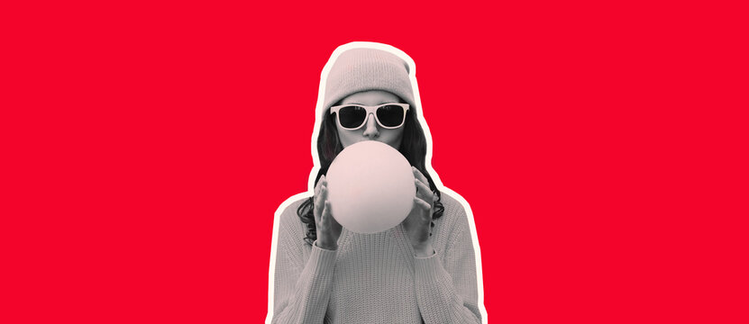 Fashionable colorful portrait of stylish cool young woman inflating chewing gum or balloon wearing hat on red background, magazine style