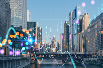 Panorama cityscape of Chicago downtown and Riverwalk, boardwalk with bridges at sunset, Illinois, USA. Forex graph hologram. The concept of internet trading, brokerage and fundamental analysis