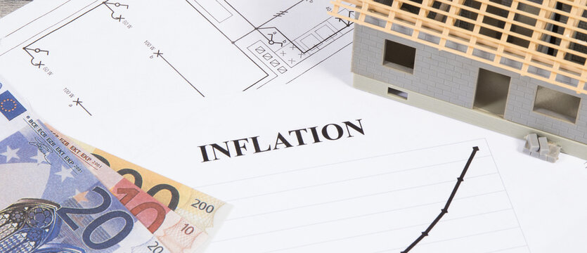 Inscription inflation, currencies Euro, toy house under construction and construction drawings. High prices of real estate, building or rent home