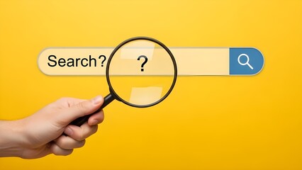 Hand holding magnifying glass over online search bar with question mark on yellow background