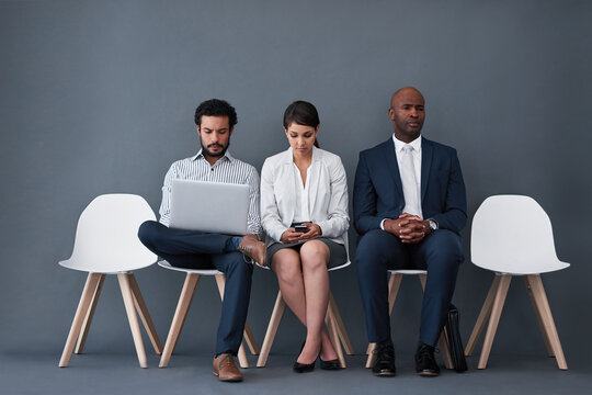 People, laptop and queue for interview, job or opportunity with reading, info or company website. Group, waiting room and phone for recruitment, onboarding or human resources with diversity at agency