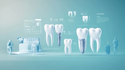 Step by step process of dental implant placement with clear infographic design in soft blue tones for educational purposes in healthcare