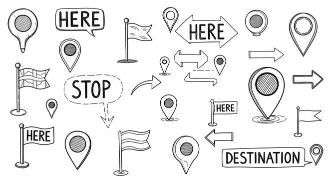 Hand-drawn map pointers and location icons vector navigation elements for maps and infographics isol