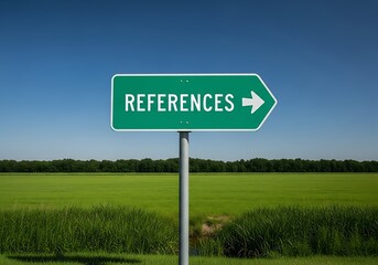 Directional green highway sign reading REFERENCES pointing right across a lush field, symbolizing citation, documentation, external sources, and the path to essential research information