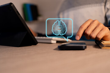 Artificial intelligence (AI) technology for data analysis. Businessman uses a virtual assistant from different devices