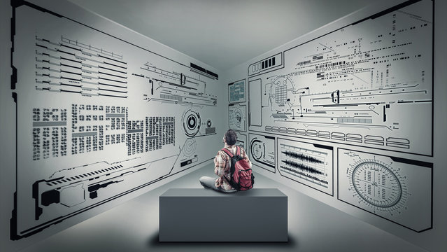 Teenage girl in a school informatics classroom looking at a computer screen monitor with programming codes Student learning digital software lessons Online education Technology science Communication
