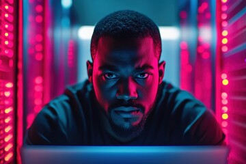 Africa Data. Black Man in Data Center Management with Laptop and Server Room. Technology and Information Analysis