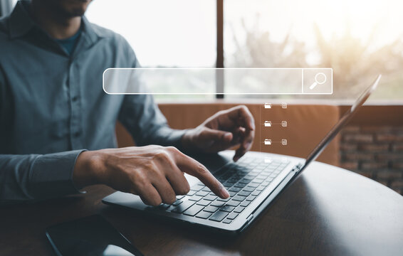 Searching Browsing Internet Data Information with blank search bar.SearchEngine Optimization SEO Networking Concept.handof businessman working with computer laptop on desk in office.