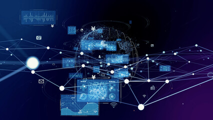 グローバルネットワークと映像テクノロジーのコラージュ バナー・広告向け横長ビジュアル