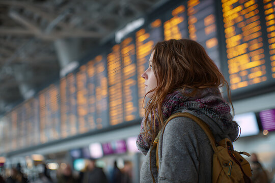 airport departure board displays the word "Delayed," symbolizing the frustration and anticipation of travelers waiting for their flights amidst busy airport activity