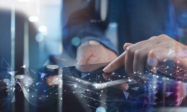 Digital technology, big data concept. Woman using mobile smart phone and laptop computer, abstract futuristic technology background